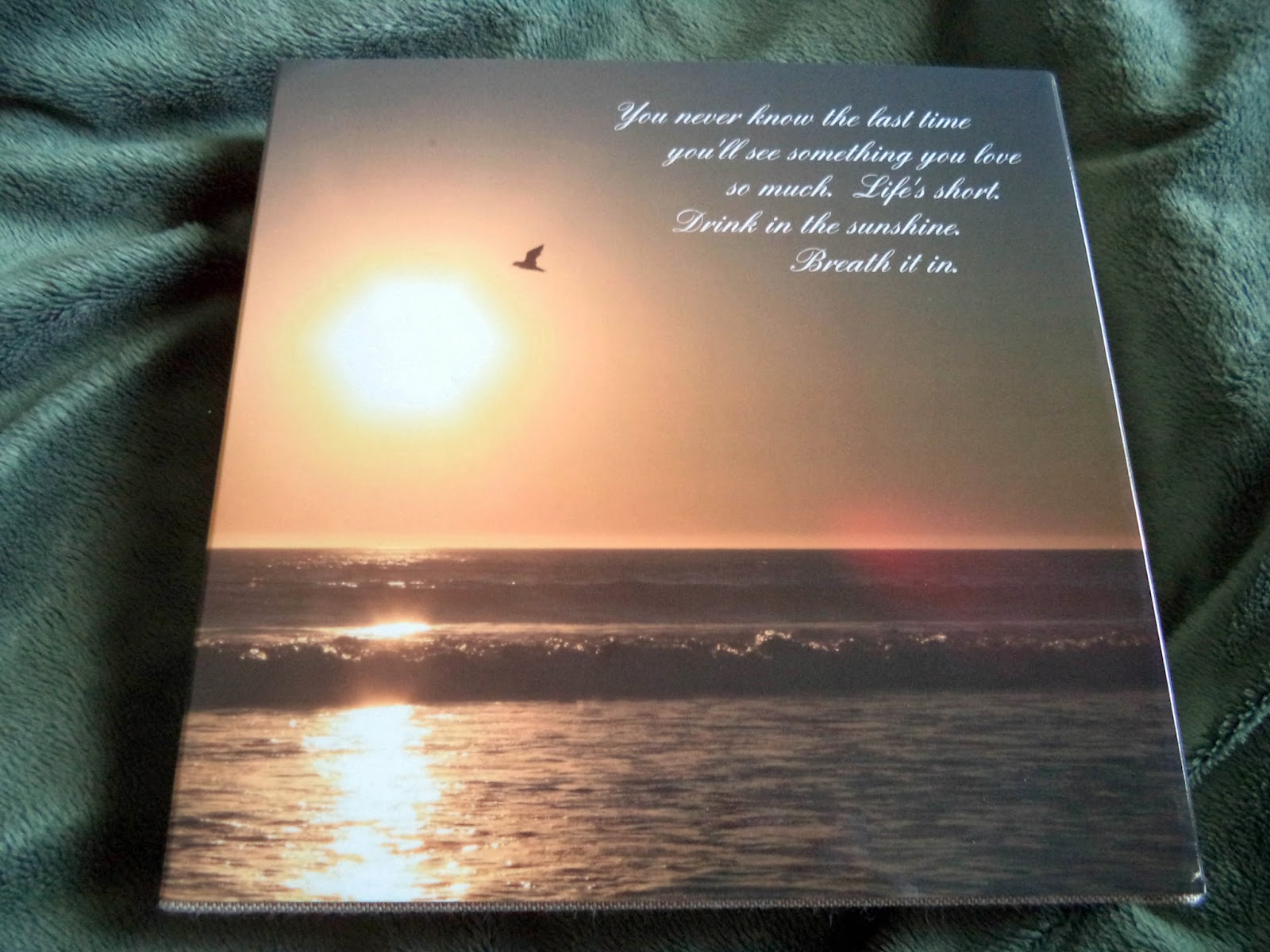 The back cover. The picture is from a photo my Mom took while visiting the Ventura Beach. The saying on the back is a line I wrote, "You never know the last time you'll see something you love so much. Life's short. Drink in the sunshine. Breath it in."